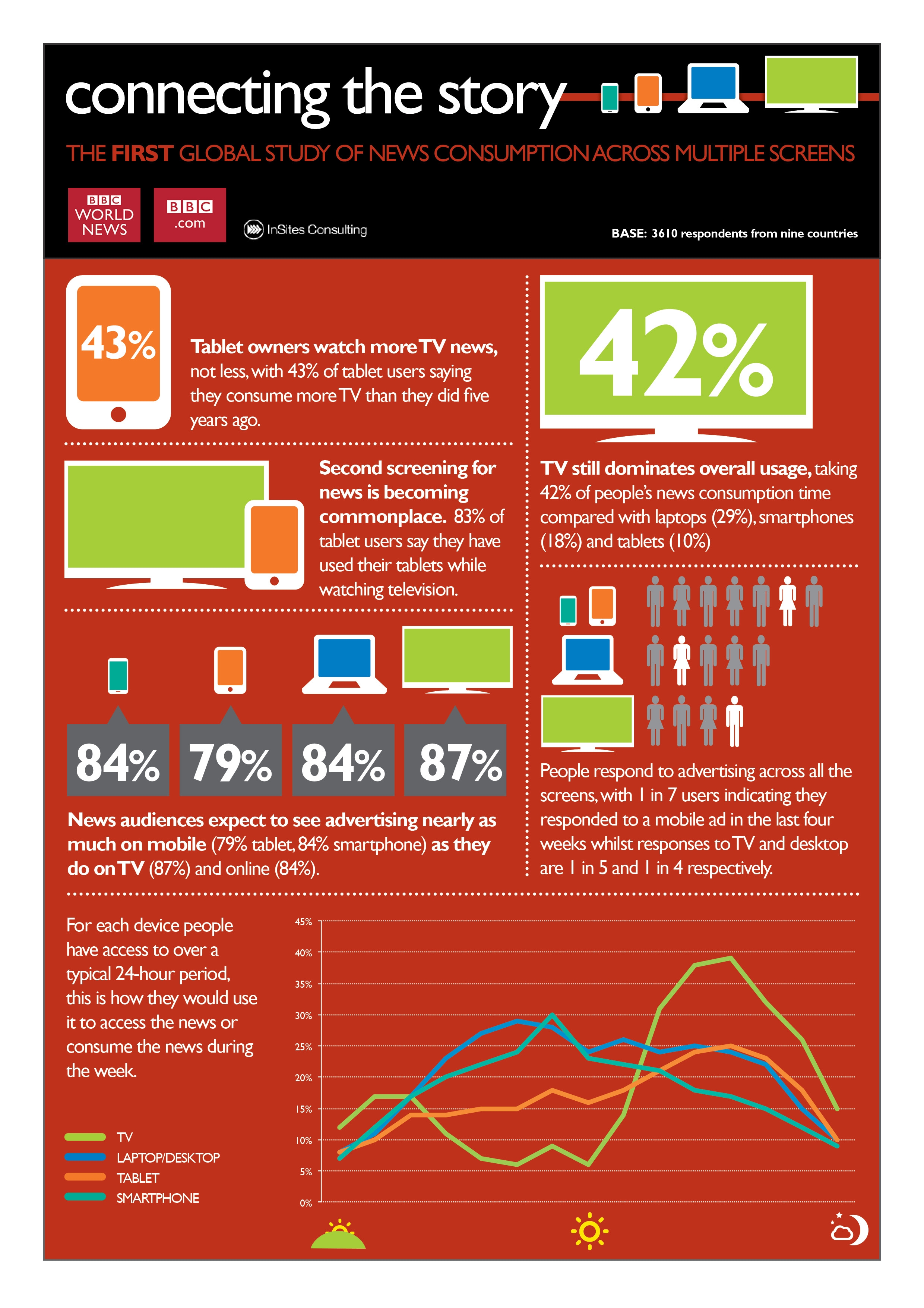 The BBC’s commercial divisions, BBC’s World News and BBC.com, who conducted the research, say the survey is “the largest global study to date on the consumption of news in the digital age.” The BBC says that tablets, rather than competing with TV, are increasingly being used as second screens by viewers.