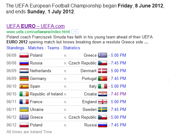 One of the easiest ways to plan your schedule is to simply use Google. Google provides unique listings for each of the matches directly in its search results. These custom results show you when each match is on, which teams are playing and what times the marches start (according to your time zone). Google will also directly link you to the official UEFA page for each match which will give you the latest details and statistics.