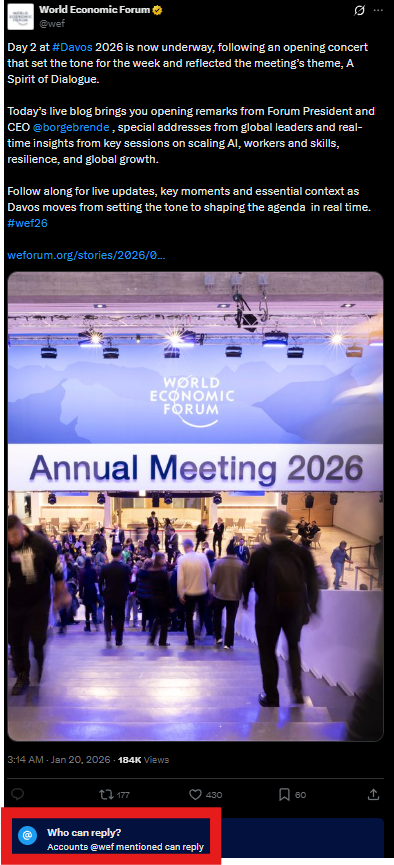 But even as the WEF Annual Meeting 2026 was going down, the WEF restricted all replies from users it didn’t mention on X.