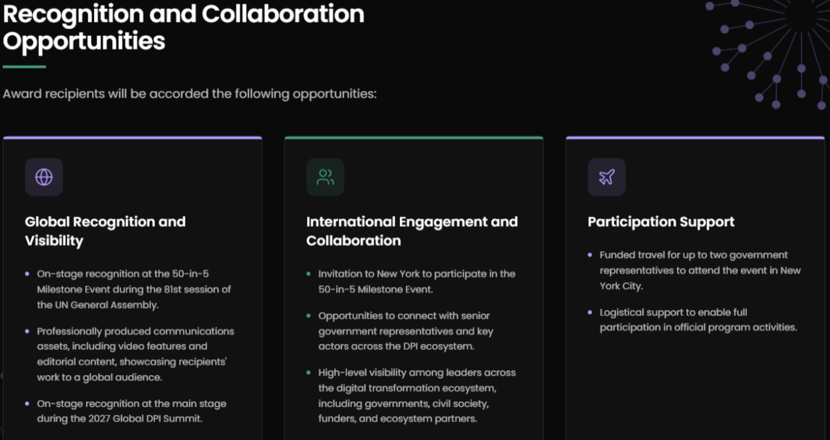 - Impact: The Impact Award recognizes a country where digital public infrastructure is delivering meaningful improvements to people’s lives. It celebrates tangible outcomes that show how DPI is driving real-world change — such as expanding access to essential services or reaching more people effectively.