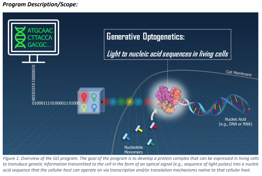 “The DARPA GO program aims to develop a protein complex, referred to here as a nucleic acid compiler (NAC), that can be expressed within living cells to allow an end user to program genetic instructions into those cells, template-free, using nothing but light to transfer the genetic information to the cells”