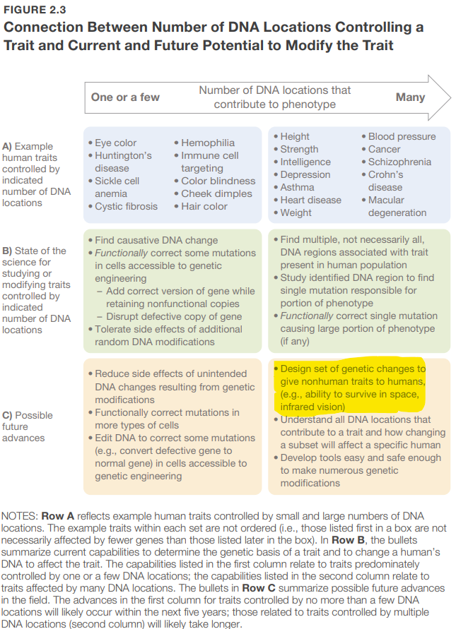 “Genetic modifications might be needed to allow human populations to live in locations other than Earth. Suggestions include adding genes from Deinococcus radiodurans, a bacterium that can survive in high levels of radiation, and adding genes from a variety of organisms to enable humans to synthesize all 20 amino acids (humans normally synthesize only 11 and extract the remaining nine from food)”