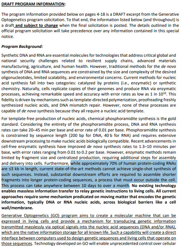 As of today, “No existing technology enables massless information transfer to relay genetic instructions to living cells. All current approaches require some mechanism predicated on moving matter that encodes the genetic information, typically DNA or RNA nucleic acids, across biological barriers like a cell wall/membrane,” according to the program draft description.