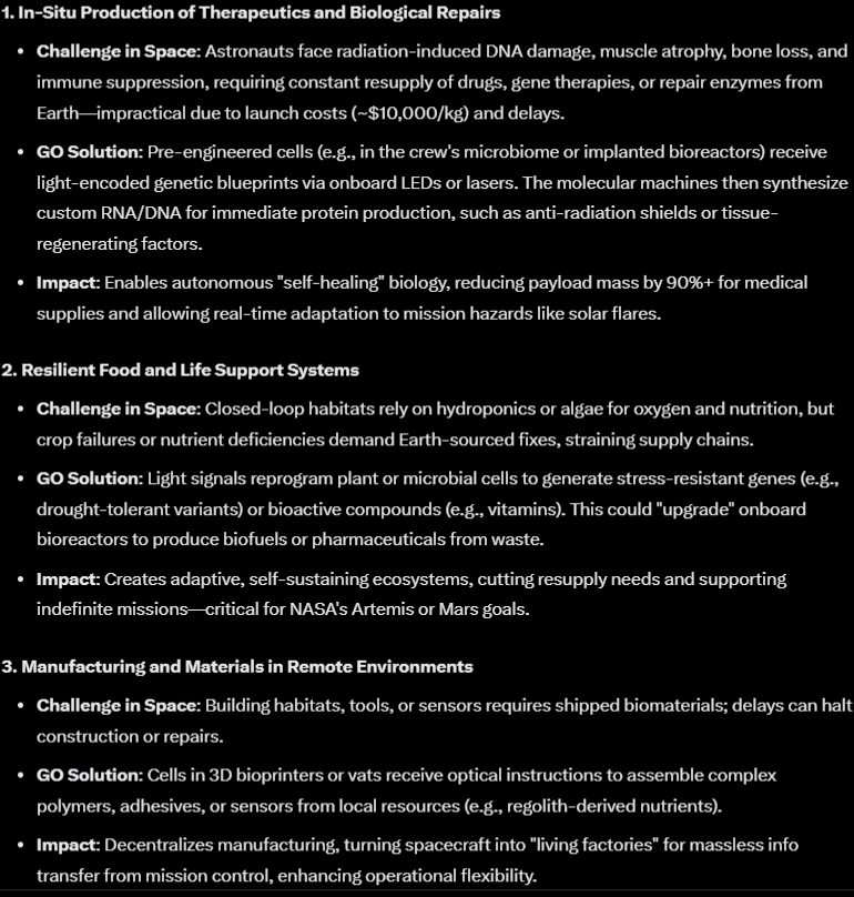 If you ask Grok how DARPA GO could aid in extended human spaceflight, it spits back use cases such as pre-engineering cells in the crew’s microbiome, along with giving them anti-radiation shields and autonomous self-healing biology, in addition to resilient food and life support systems and manufacturing capabilities: