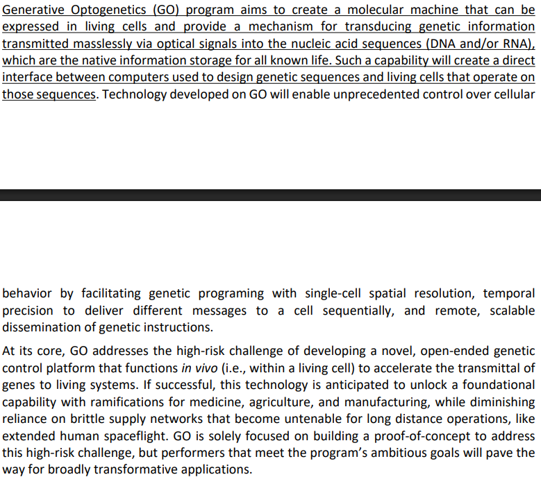 And the only medium by which DARPA seeks to transfer the genetically programmed instructions onto the living cells is via light, aka optogenetics.