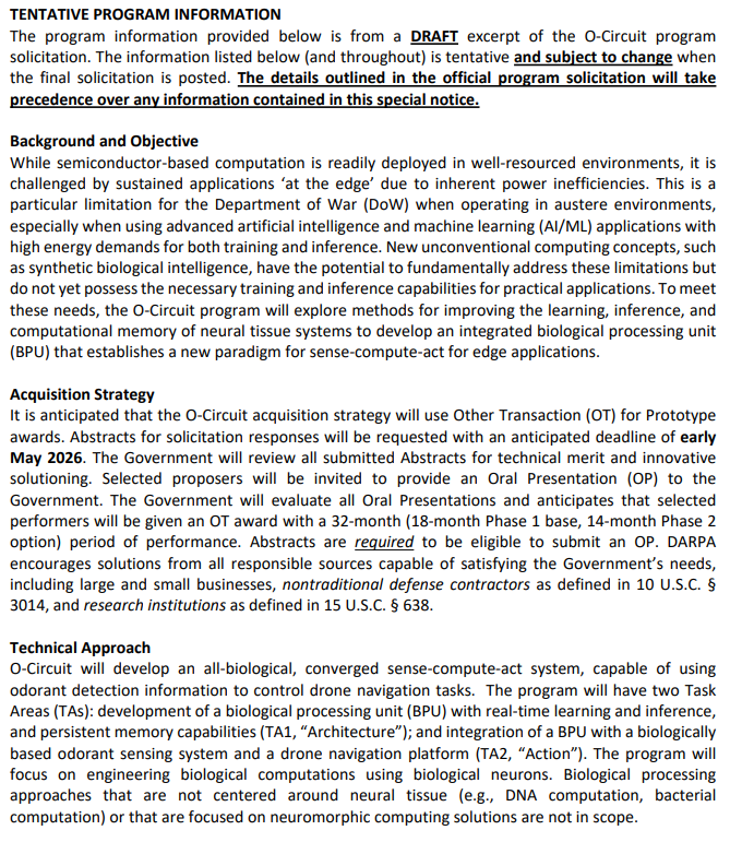 DARPA, Organoid Cytomorphic Intelligence Resulting from Convergent Understanding and Information Transfer (O-Circuit) program, March 2026