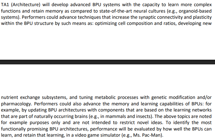 For the Architecture task area, the biological processing unit will have the ability to “learn more complex functions and retain memory” as compared to other organoid-based systems.