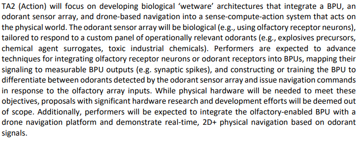 “(Action) will focus on developing biological ‘wetware’ architectures that integrate a BPU, an odorant sensor array, and drone-based navigation into a sense-compute-action system that acts on the physical world”