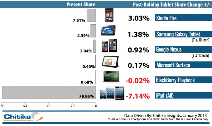 Although still dominant, the Apple iPad’s (all versions) market share fell by a massive 7.1% in the days after Christmas, and now stands at 78.9% according to data from Chitika, a company that sampled “hundreds of millions” of mobile traffic impressions across its ad network in North America only.