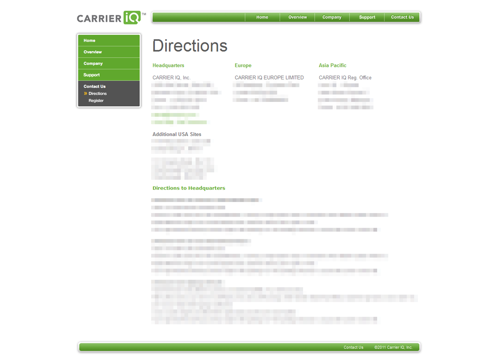 In other Carrier IQ news the company has taken the drastic step of removing most of its contact information from its website. Between November 30 and December 2 the company edited its site’s Contact Us page to remove detailed directions to its Mountain View Headquarters, while also removing some lines in its US, UK, and Malaysian addresses.