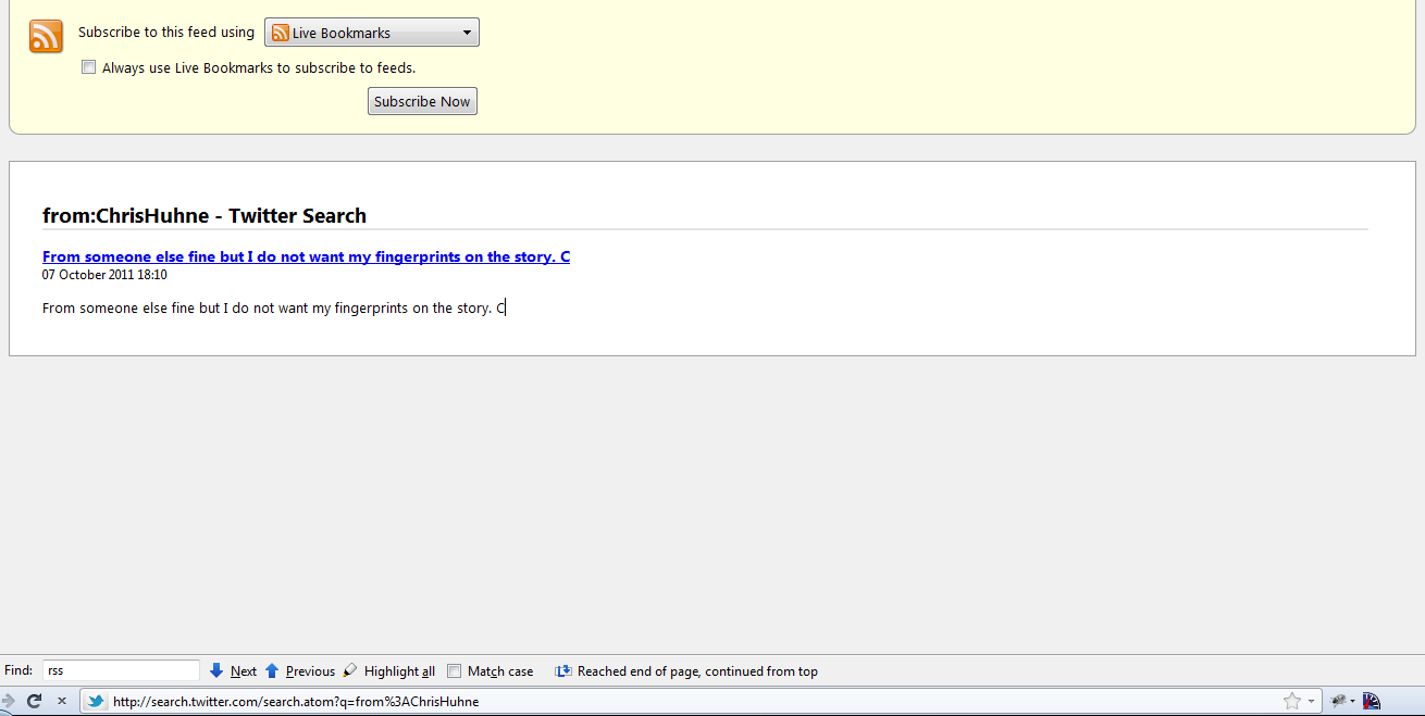 The tweet was posted on October 7 at 18:10 and deleted about an hour later. Unfortunately for Huhne, while the tweet might be gone from his public stream it is still visible on his Twitter account’s RSS feed. In fact it’s the only tweet there.