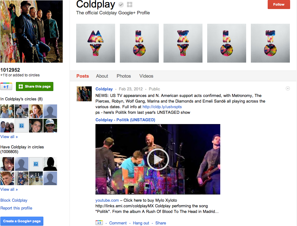 Coldplay is the most popular brand on Google+ after becoming the first Google+ page to be circled over one million times. The long-formed British rock band has rocketed to the number one spot, having increased their following by some 360,000 Google+ users this month alone.