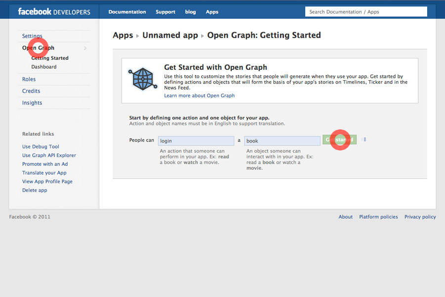 3. Click on Open Graph, type in any action and object and click Get Started.