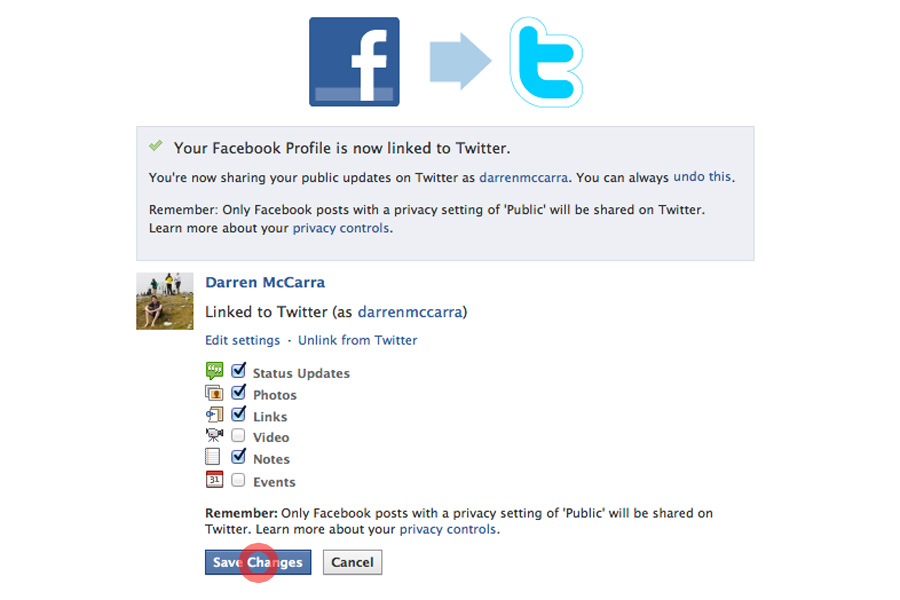 3. Once your Twitter account is authorised on Facebook you can individually select whether to share status updates, photos, links, videos, notes and events. Note that only public Facebook updates will be shared to Twitter.