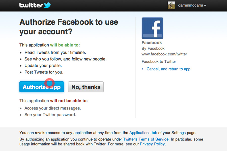 2. Now click Authorize app to grant Facebook access to your Twitter account
