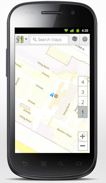 Brian McClendon, VP of Engineering at Google Earth and Maps described how the system works in the blog announcement today, “Detailed floor plans automatically appear when you’re viewing the map and zoomed in on a building where indoor map data is available. The familiar “blue dot” icon indicates your location within several meters, and when you move up or down a level in a building with multiple floors, the interface will automatically update to display which floor you’re on. All this is achieved by using an approach similar to that of ‘My Location’ for outdoor spaces, but fine tuned for indoors.”
