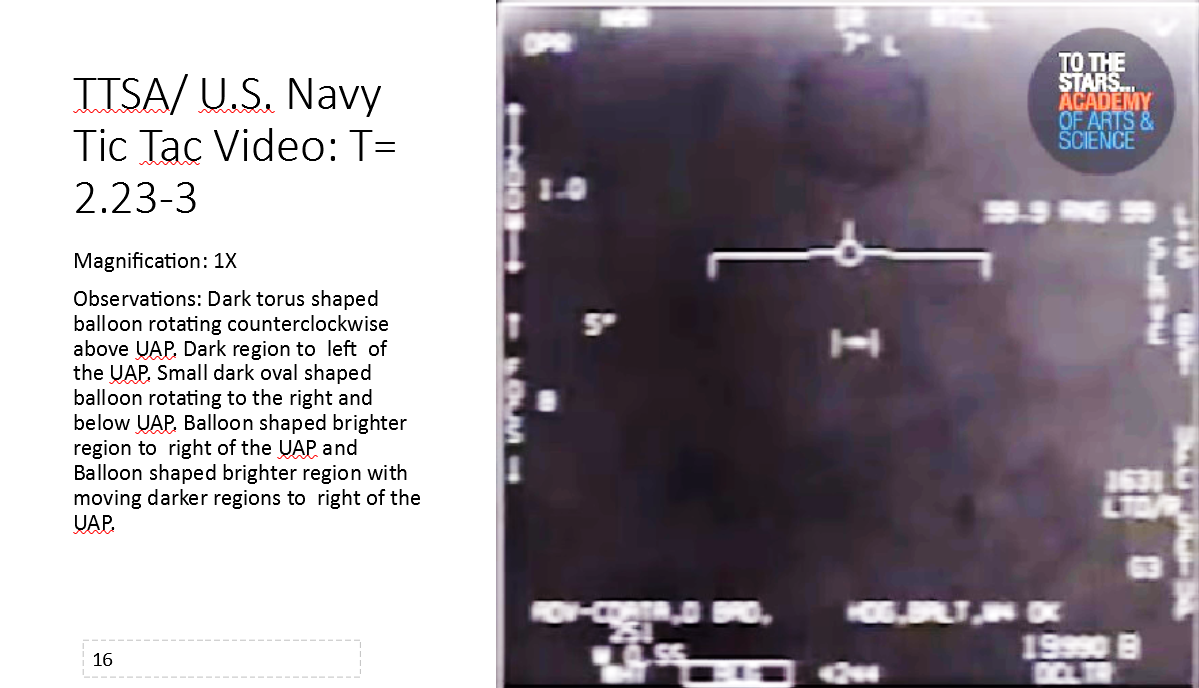 A balloon shaped brighter region to right of the UAP appearing warmer on IR was observed. Also observed was a balloon shaped brighter region with moving darker regions to right of and under the UAP directly to the right of the small dark oval shaped balloon. See slides 14 –17, 28 — 29, and 31 – 35 [below].