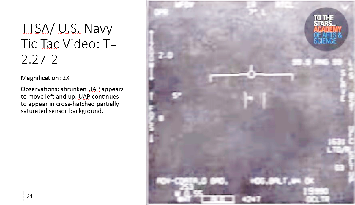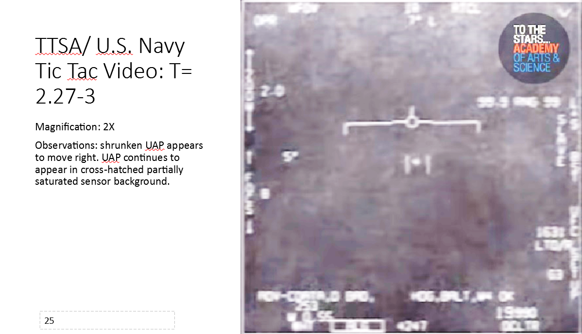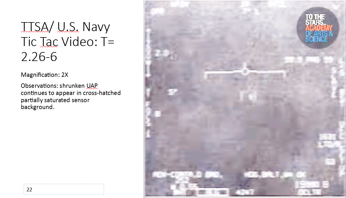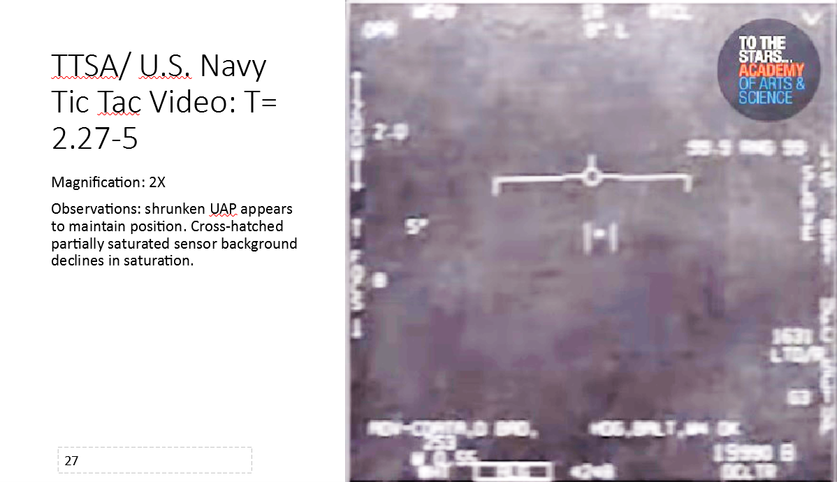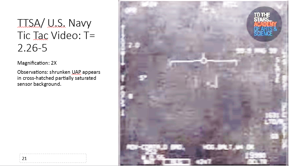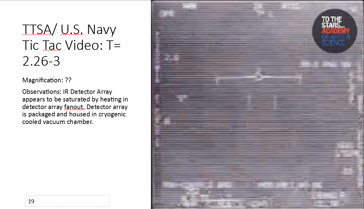 - “The UAP appears to be hitting the Nimitz aircraft with an electromagnetic pulse that charged the IR detector array fanout on the back of the array causing it to saturate. The image observed shows the fanout behind the array in that frame. I don’t know what the Nimitz aircraft did to the UAP that would be considered hostile by the UAP.”