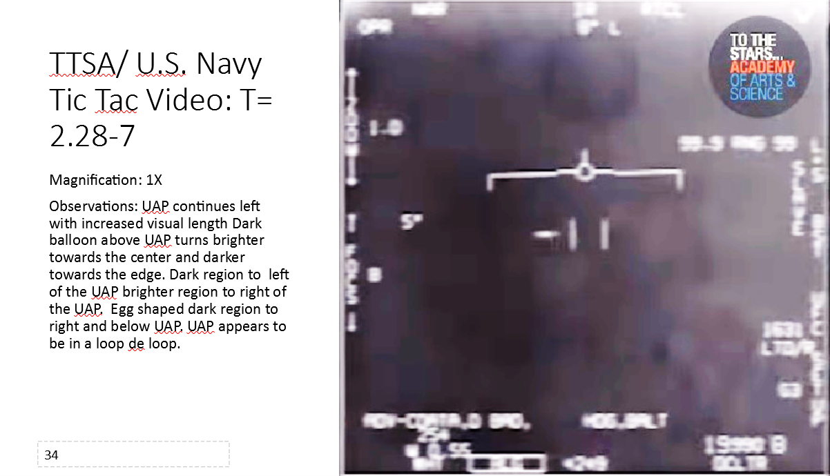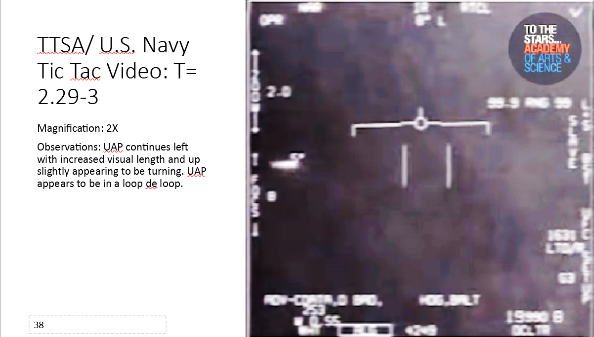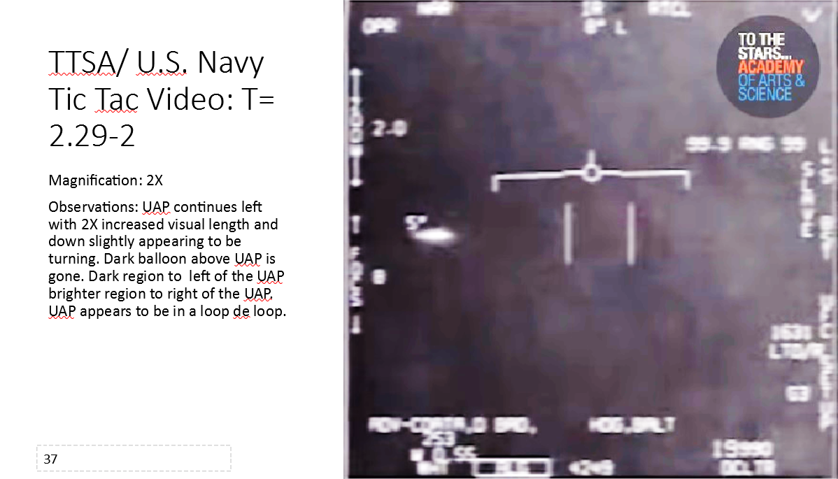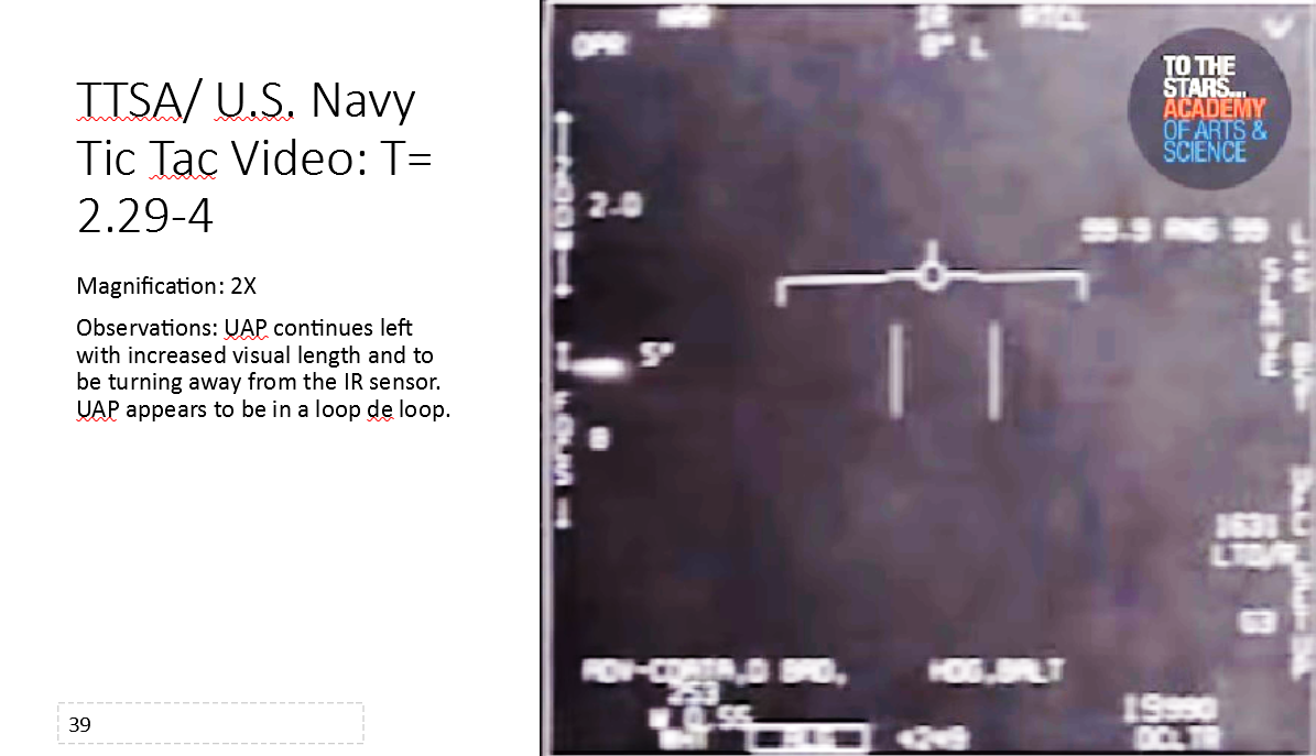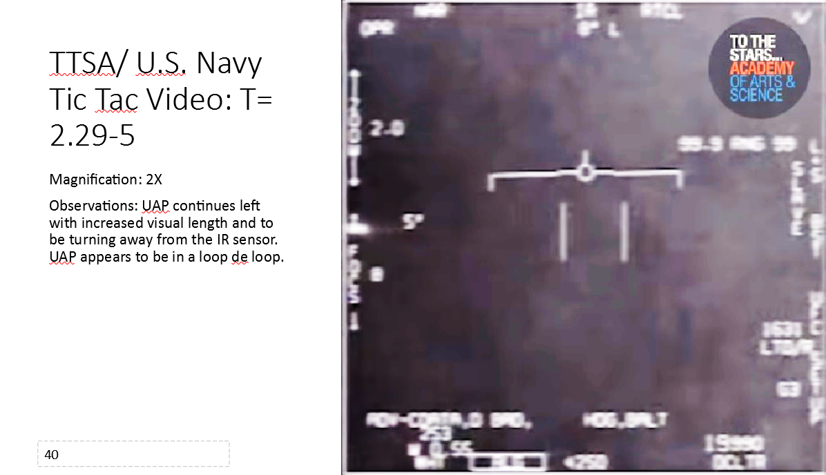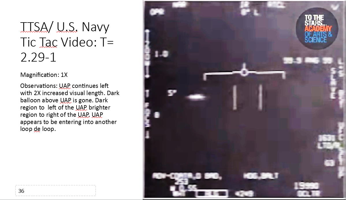 In slides 31 through 40 high acceleration of the UAP is observed and the UAP appears to harness a loop de loop to increase its acceleration to sub-relativistic speed.