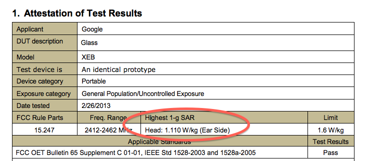 Responding to a question on Quora, Tawkon says a Google Glass prototype submitted for FCC testing was found to have an SAR of 1.1W/Kg (Watts per Kilogram).