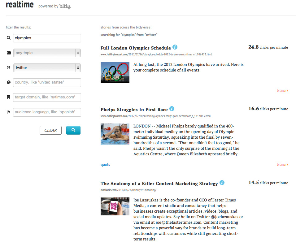 So Realtime aggregates all links saved, shortened or shared using bitly, analyses the content of each link and then determines what links are receiving the most attention lby looking at click distributions to links at keyword, URL and story level – in realtime.