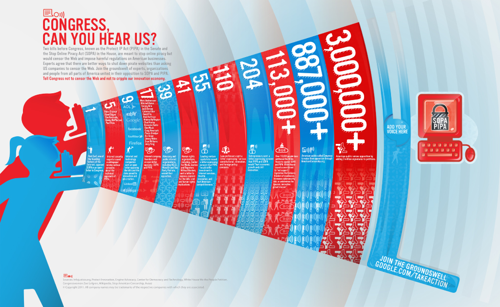 Google lead the way in raising awareness of the Stop Online Piracy Act (SOPA) and Protect Intellectual Property Act (PIPA) in Wednesday’s online anti-SOPA, anti-PIPA protests. Despite limiting its protest to the US and after being criticised for only placing a link, rather than a redesigned logo on its US homepage, just under a third of a million people tweeted links to Google’s anti-SOPA/PIPA sub-site.