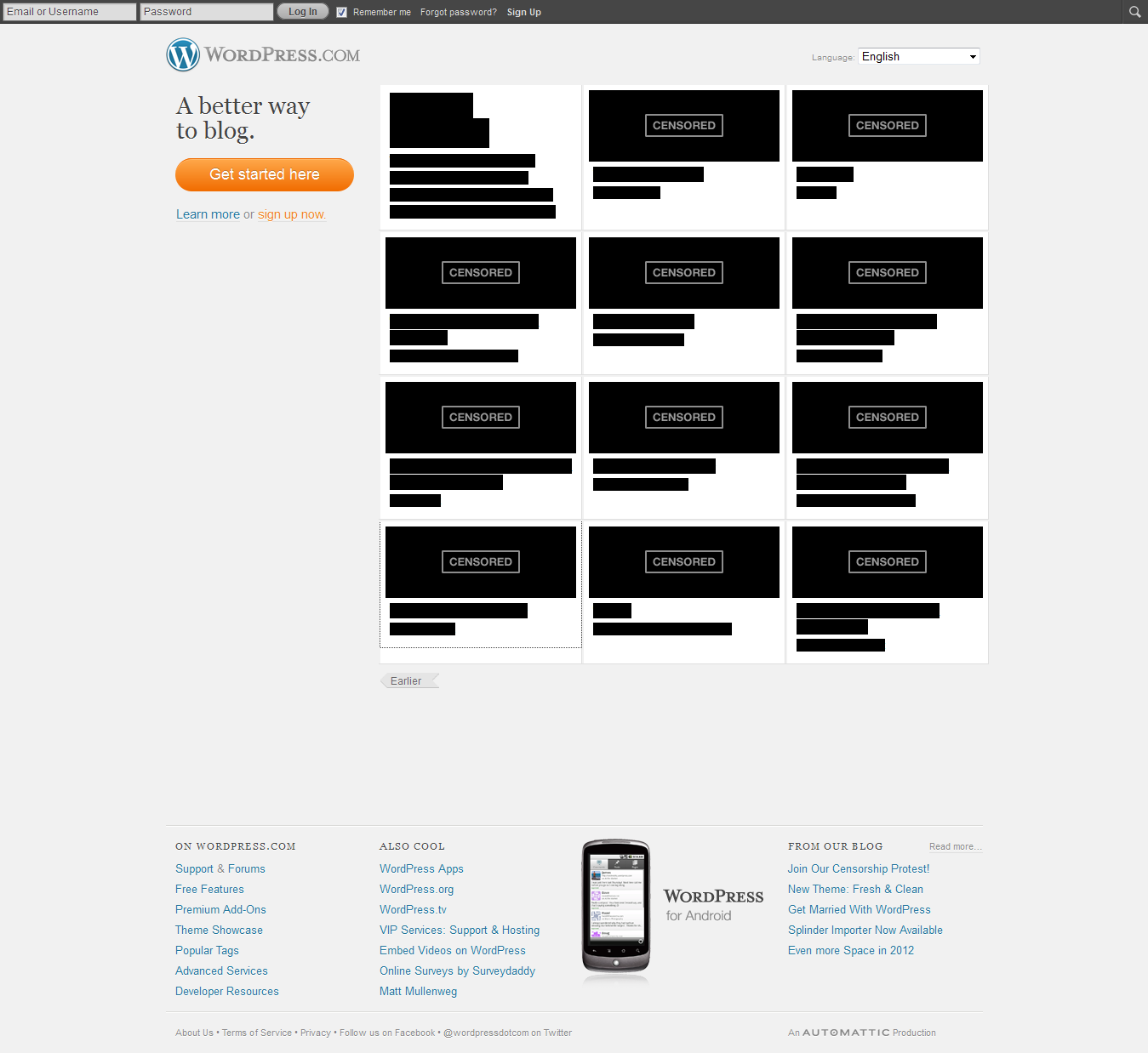Wordpress.com censored itself today and replaced its usual homepage with links to SOPAstrike.com. Topsy reports that over 53,500 tweets were sent today about the blogging network’s blackout.