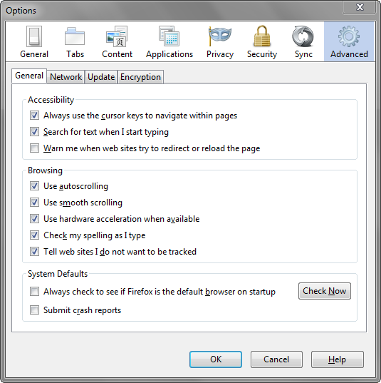 To activate the do not track feature Firefox 4 users need to click on Tools and then Options. In the pop-up window select the Advanced tab. Then select the third check-box from the bottom, called “Tell web sites I do not want to be tracked“.