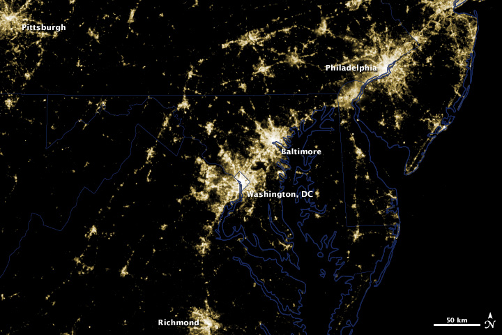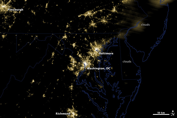 NASA’s Suomi National Polar-orbiting Partnership satellite used its Visible Infrared Imaging Radiometer Suite (VIIRS) system to take these aerial photographs of the North Eastern US, showing Washington DC, and Baltimore suffering from extensive power outages (note: Philadelphia is not visible in the after-photograph as it was under cloud cover at the time).