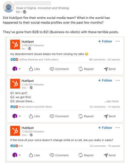 LinkedIn post calling out HubSpot’s LinkedIn posts