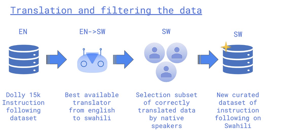 Another potential solution is taking an existing instruction dataset in English and translating it into Swahili. This could be done by translators who speak both Swahili and English but this can also be time and resource intensive. An automatic translator could be used, however, this typically results in insufficient or poor-quality results.