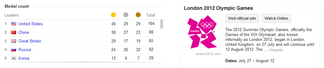 This year, in both the UK and USA, one search term broke out against all others to become one of the fastest growing during the two weeks of the London Games. That was searches for the overall “Medal Count“. This could be because the broadcast media was obsessed with counting the number of medals the USA, UK and Chinese teams won – or because Google placed the medal leader board on all search results pages for Olympic related terms, either way this year we really wanted to know how many medals each country won.
