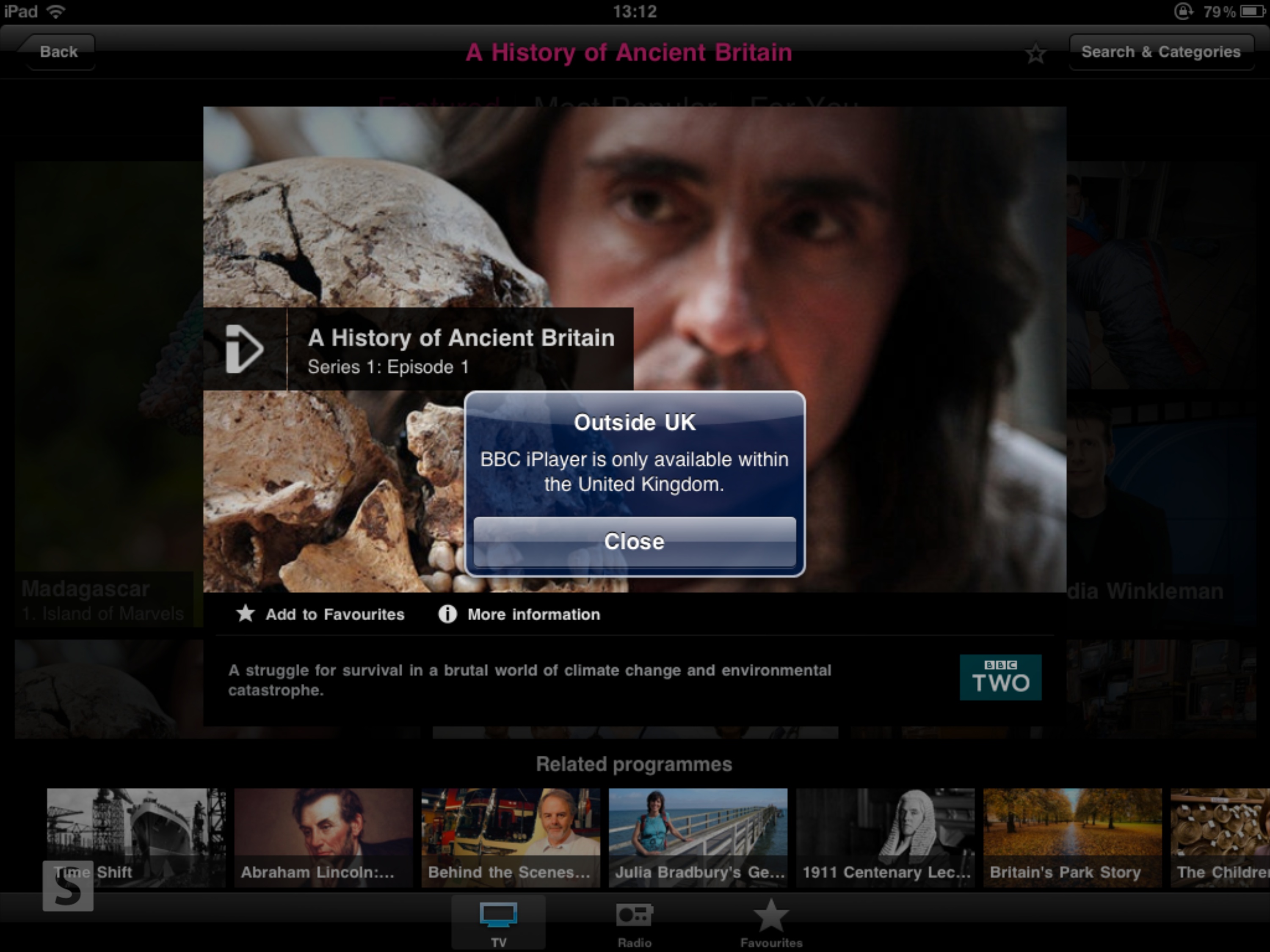 In typical BBC style the app itself, or at least the iPad version, is really nice. It’s clean, simple to use, and full of great imagery. Users can browse by category or use the organic search feature. They can also browse by Featured, or Most Popular programmes, and can tag content to Favourites for later viewing. It’s all very simple and usable.