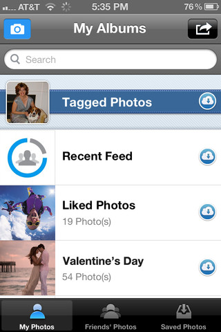 All photo albums and photo groups can be downloaded in their entirety to your iPhone and can be used within the native Photo app or shared by email. This includes the ability to download all photos of your friends, which, to me, seems slightly odd.