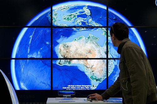 The store itself is designed as a spaceship and with an Android tablet hooked up to nine massive flat screens you can pilot the ship using Google Earth.