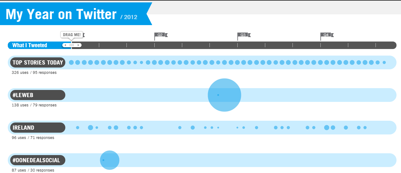 So that was 2012 on Twitter. You can see the full set of data at Twitter’s Year in Review website and you can create your own interactive Twitter Year in Review on Vizify website. If you want to read more about 2012 have a look at Google’s Year in Review and Facebook’s Year in Review, which also allows you to create a custom Year in Review timeline.
