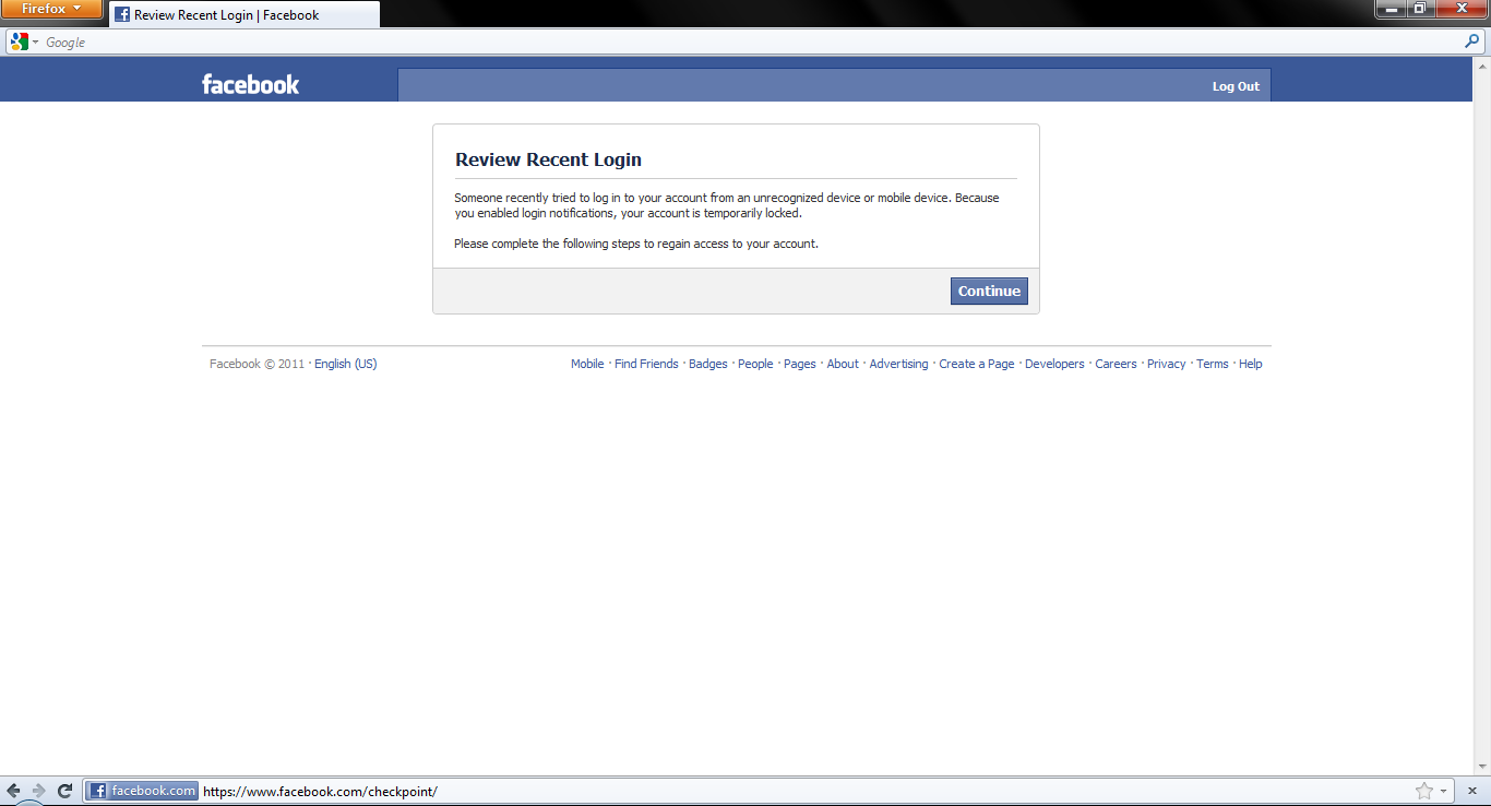 "Someone recently tried to log in to your account from an unrecognized device or mobile device. Because you enabled login notifications, your account is temporarily locked."