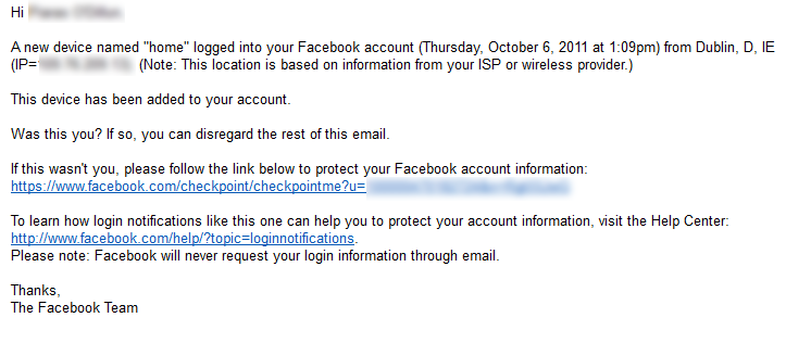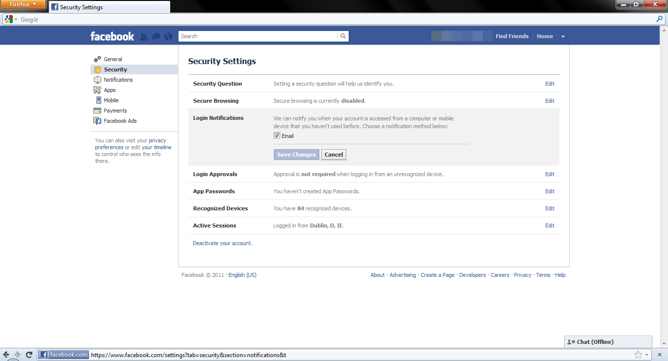 In fact it was me (with my JavaScript turned off – don’t ask); but the reason I knew of this possible privacy breach was because of a little known Facebook security feature – Login Notifications.