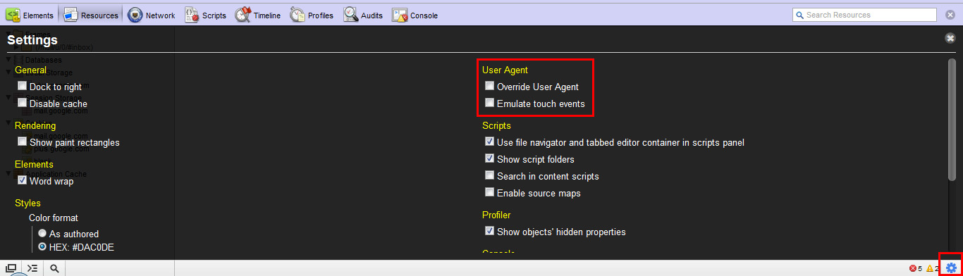 Next, under the section marked “User Agent”, select Override User Agent and in the dropdown menu select “iPad – iOS5”. This will fool the website to load the iPad version of the page. Just below this section select “Emulate touch events.”