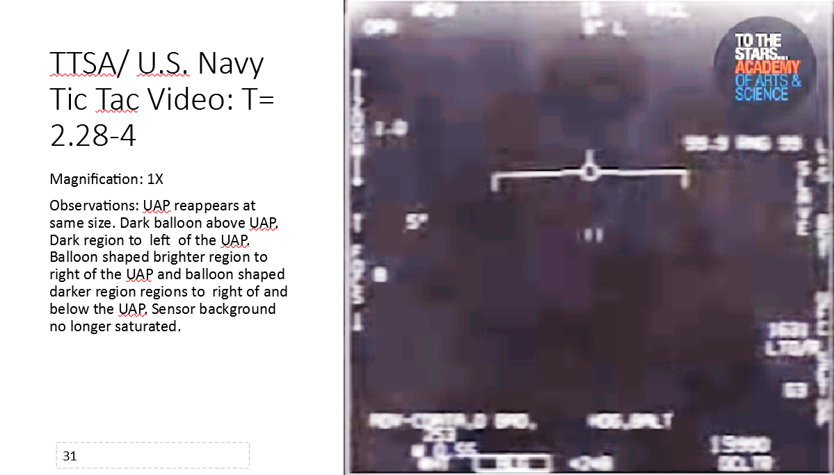A balloon shaped brighter region to right of the UAP appearing warmer on IR was observed. Also observed was a balloon shaped brighter region with moving darker regions to right of and under the UAP directly to the right of the small dark oval shaped balloon. See slides 14 –17, 28 — 29, and 31 – 35 [below].
