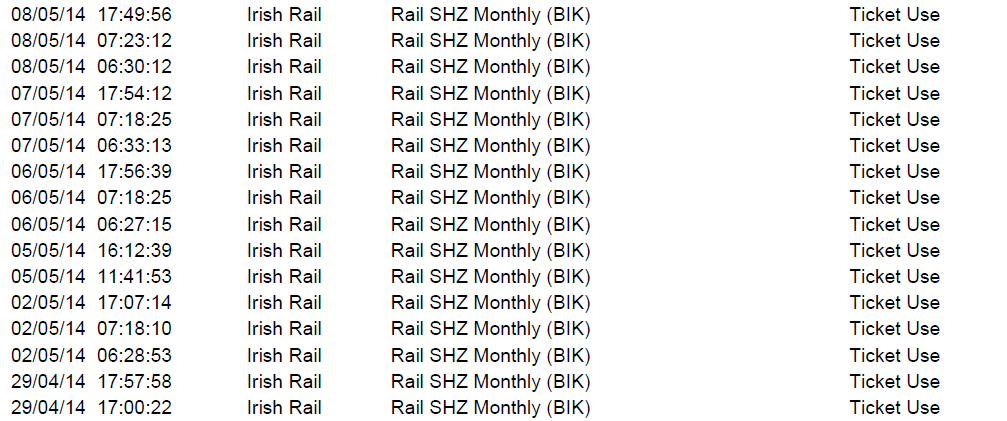 A standard Leap Card records the user’s payment history; if registered the card records the user’s name, age, address; and, most interestingly, it make a record of each time a card is used. This record includes the date and time the card was used and the service (Bus, Rail, Luas) it was used on. Importantly, it doesn’t include information on the specific service location (e.g. Pearse Street Station).