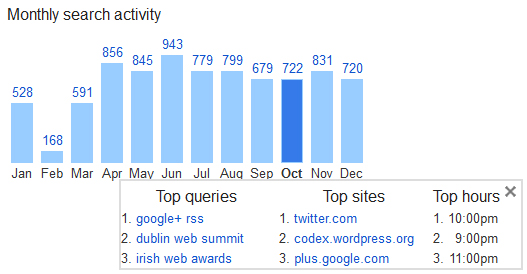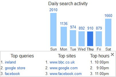 As well as collecting your search terms and clicked sites Google has also been able to analyse the number searches you have conducted (when logged into your Google Account) and what times of day you are most likely to search. This behavioural data can tell you (and Google) much about your digital activities.