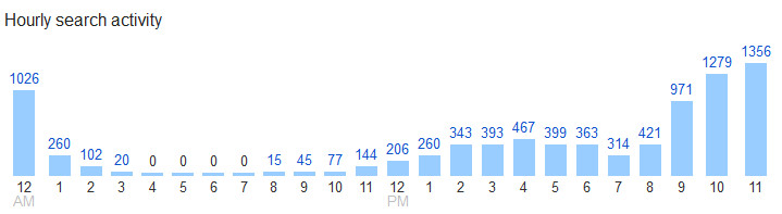 So what does Google know about me? According to Google’s search behaviour graphs, I conduct most searches between 9pm and 12am. I usually stop searching from 4am and am back using Google search from 8am.