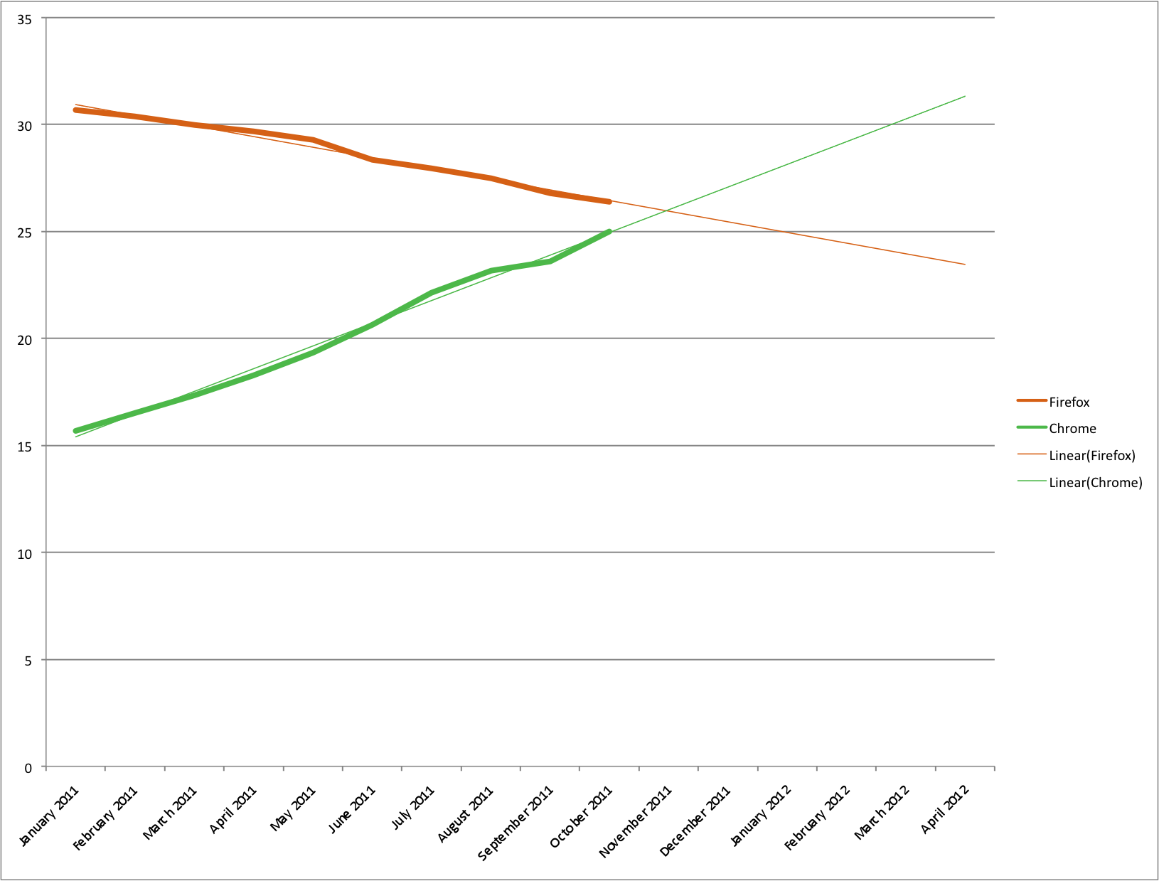 Previously we estimated that Chrome will overtake Firefox on just over 26% market share. As of the end of this month, October, Chrome stands on 25% market share and Firefox on 26.4%. If trends continue through November, Chrome will gain just over 1% share and Firefox will decline by another 0.5% or so.