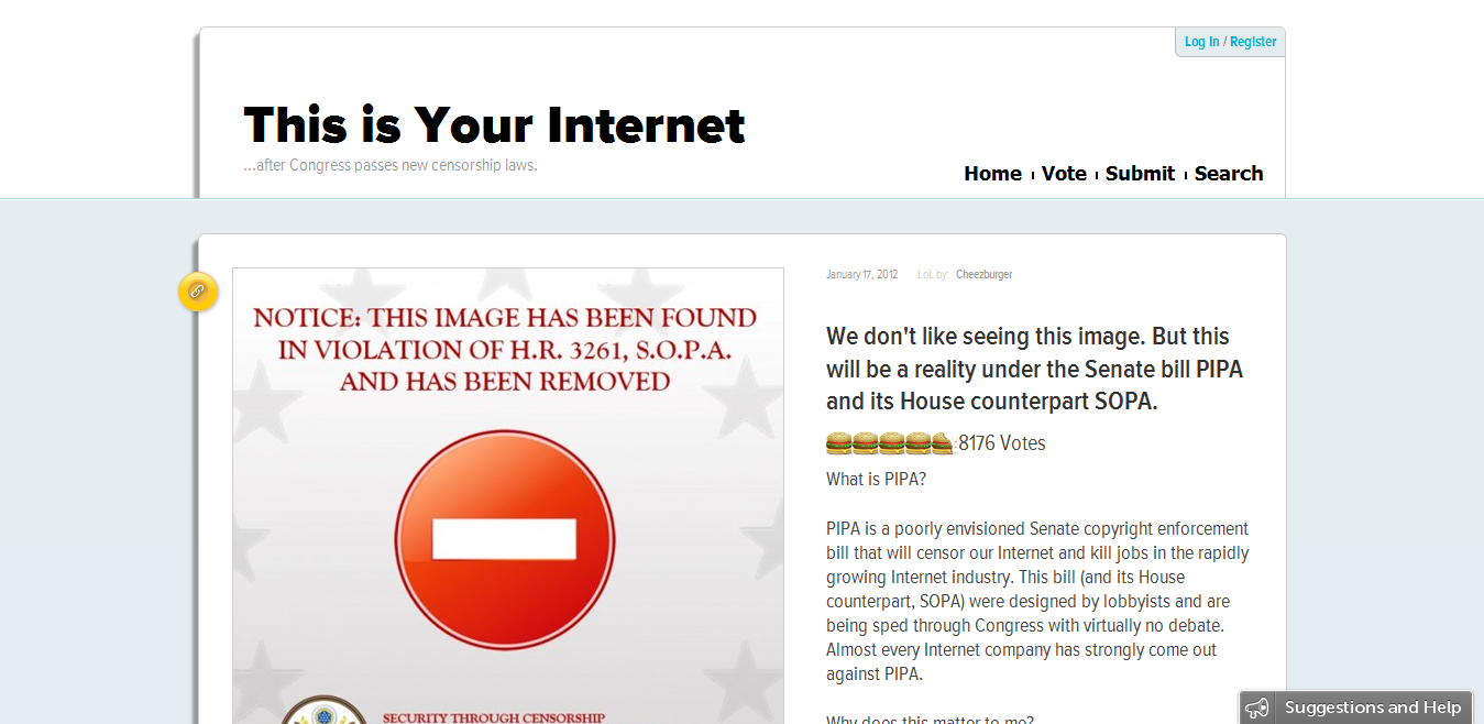 ICanhasCheezBurger’s anti-SOPA page, according to Topsy, generated a disappointing 400 tweets on Wednesday.  Across the ICanhasCheezBurger.com site Topsy reports that there were about 600 tweets to pages on the site that mention SOPA.  Like Reddit, this number is surprisingly low considering the size of the site.