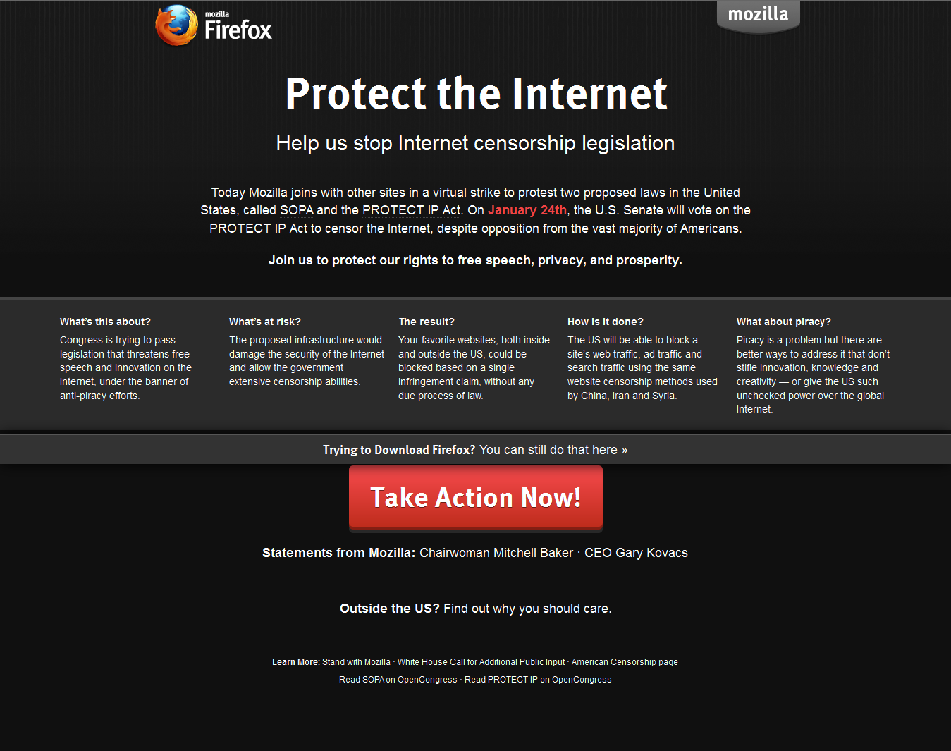The Firefox maker begin protesting against SOPA and PIPA over two months ago, and over this time Mozilla has maintained its own anti-SOPA page and co-written an open letter against the acts with Google, Facebook, Zynga and others.  Over the past two months Mozilla has generated just under 20,000 tweets about SOPA and PIPA, about 15,000 of which were created today.