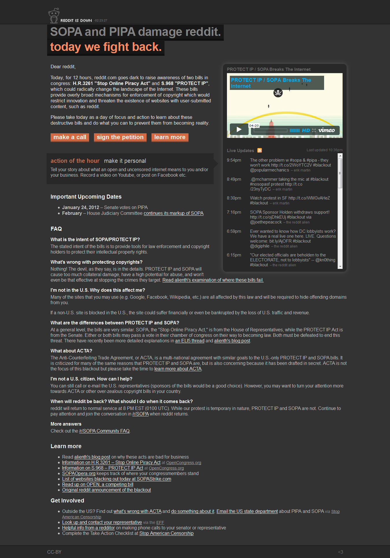 Wikipedia was more active in protesting against SOPA and PIPA.  Wikipedia’s protest prevented visitors from seeing any content on the site, save for one page that explained SOPA and PIPA.  In place of the site’s usual content Wikipedia blacked-out the site and explained to users;