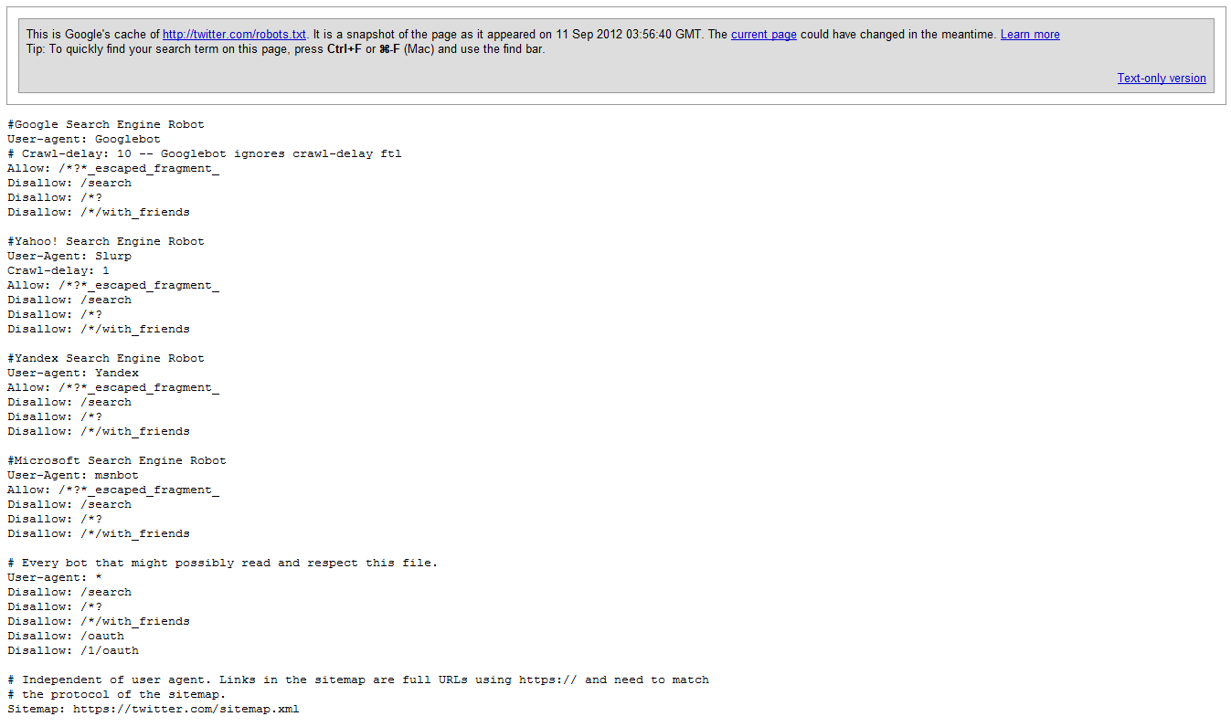 Twitter’s robots.txt file – a small file that webmasters use to allow or prevent search engines from indexing parts of their sites – was changed today to allow search engines to index more of its site.