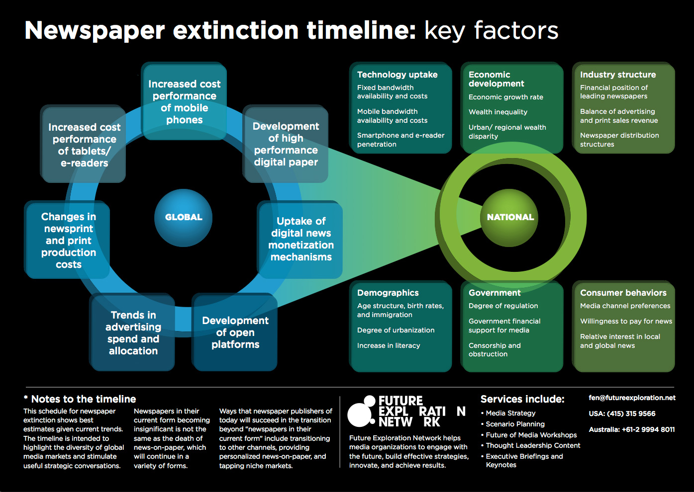 Dawson uses a number of factors in determining these fateful dates. These include global influences like increased cost performance of reading devices and network charges, changes in newsprint and print production costs, the uptake of digital news monetization mechanisms, trends in advertising spend, and the development of open platforms.