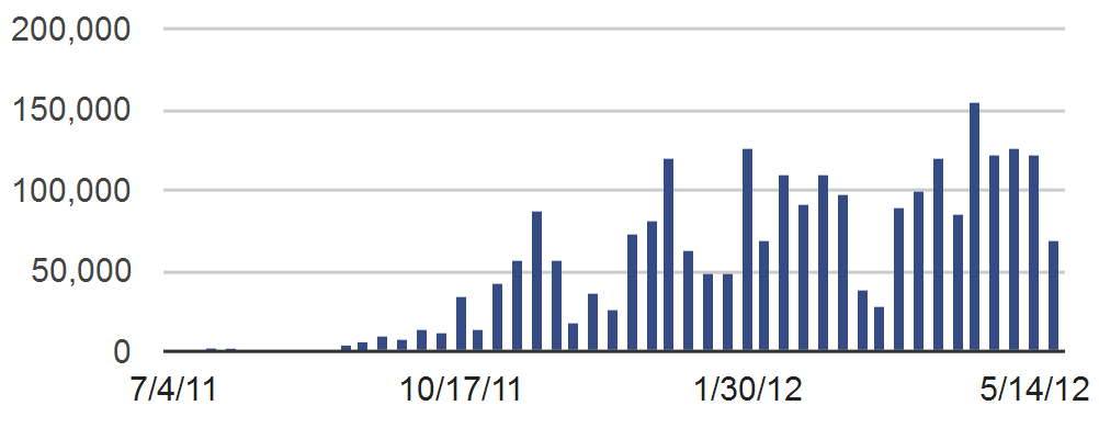 The data in this release covers 95% of copyright claims made to Google since July 2011 using the company’s web form and only covers Search – removal request made against YouTube and Blogger are not included (so the copyright claim by AVG that forced YouTube to block the classic Rick Roll video for 24 hourswon’t be included). Perhaps not surprisingly Google reports that an increasing number of removal requests are being made.